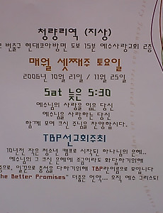 살며 살아가며/이런저런생각457 이상한 광고 오늘 아침 한국경제 신문을 보고 오는데, 이상한 광고가 실렸다. 바로 위 사진속의 광고!! 왼쪽 내용을 보면, 거룩한 성령의 이름을 언급하고 믿음을 말하고 있다. 그래서 이 광고가 지금의 어려운 사태에도 하나님이 함께 하신다....뭐 이런 내용의 광고인줄 알았다. 그런데 바로 오른쪽에 '땅사라'는 광고 였다. 북핵 위기로 두려워하지 말고, 북한 접경지대 땅 지금 사두면 2년뒤에는 2-3배 수익을 거둘수 있다고 신문기사까지 들어 그 내용을 믿어달라고 하고 있었다. 그 확신의 근거로는 다음의 두가지였다. 1.광고를 낸 사람들이 기도하는 사람이기 때문에 하나님이 들어주실거다. 이 말은 곧 땅값 오른다는 것... 2. 영원한 우방인 미국이 지켜줄 것이다.이런 건 어떻게 봐야하나... 개인적인 하나님에 대한 믿음.. 성직자의 정치참여... 오늘 문화일보의 한 기사를 보면서(석간이라 자주 사본다..) 기독인의 정치참여 문제에 대해 생각해보게 되었다. 뉴라이트 상임의장으로 요즘 한창 뜨고 있는 김진홍 목사님 인터뷰 기사가 실렸는데, 단기적인 목표로 다음 정권교체를 꿈꾸고 있다고 했다. 그리고 뉴라이트는 시민운동단체가 아니라 시민정치운동단체라고 했다. 정치참여에 대해 전혀 문제성을 가지고 있지 않으시다는 증거다. 이런 기사를 접하는 진보층에 있는 많은 사람들은 김진홍 목사를 어떻게 바라보게 될까? 그리고 그들중 교회를 다니고 있는 사람들은 또 어떻게 생각할까? 이름 뒤에 '목사'라는 희한한 직함이 붙어 있는 것을 보고서 '목사가 교회나 잘 지킬것이지 왠 정치야?'라고 하지는 않을까 염려가 되기도 한다. 우리 사회가 진보와 보수로 나뉘여있고, 그.. 수요일 오후 쭈의 하루 일주일전부터 배가 아팠다. 머리도 아프고 심장도 아프고... 사실 병원에 갈 엄두가 나지 않아서 참았는데, 도저히 못참겠어서, **114 이용해서 지금 공부하고 있는 도서관 근처에 병원을 찾았다. ㅎㅎ 오호 500미터 이내에 한개 있었다. '연세***병원' 그리고 향하고 있는데, 왠 sbs 촬영차량들이 주변에 몰리기 시작한다. 바로 옆에 보니 식당이다. 스탶들 식사때문에 멈추었나 보다.. 잠시 전화가 와서 전화를 하고 있었는데...너무나 어이없는 일이 있었다. 벌이 한마리 날아와서 왼쪽 검지 손가락에 침을 한대 놓고 달아났다. 길쭉한 말벌같이 생긴 놈이었는데 놓쳤다... 왜 벌들은 나만 보면 물고 싶어하는 것일까?... 사람들은 벌이 다가오면 가만히 움직이지 말라고 했다. 그러면 그냥 간다고... 그런데.. 먹구름 새벽기도회가 끝난후, 교회 앞 버스 정류장에서 바라본 하늘... 먹구름이 잔뜩끼었다. 문화일보 너마저... 오늘 문화일보를 보니, 청와대에서 소설 '강안남자'의 선정성을 이유로 절독한 것에 대해 매우 '치졸한 짓'이라고 비판을 하고 나섰다. 그것도 지면 1면을 다 할애해서 청와대를 내리누르고 그동안 현정부에 대해 비판적인 신문에 대한 불만을 표시한 것이라고 강하게 항의했다. 언론의 힘을 다시 한번 느꼈다. 결코 정복되지 않는 곳, 여론을 '만들어 내는 곳'... 문화일보 이렇게 하는 그들의 행동은 더 '치졸해' 보인다. 청와대에서 문화일보 구독을 금지한 것 보다 문화일보에서 한지면을 다 할애해서 이 내용을 다루는 것이 더 큰 힘의 횡포로 느껴진다. 문화일보는 언제부터인가 급하게 현정부에 대해 비판적으로 변해버렸다. 우호적이기만을 바라는 것도 아니지만, 무조건적인 반대는 조중동과 같이 심하다 싶은 정도로 변해버.. 시연이 100일 시연이 100일 기념으로 아내와 함께 외출을 했다. 모처럼 외식을 하니 아내가 기분이 좋은듯. 시연이는 뭔지도 모르는 것 같고 ㅎㅎ 하지만 항상 엄마 아빠보고 활짝 웃어주는 멋진 시연이! 식사후 어린이 대공원에 무료입장(10월4일부터 무료화)해서 오후까지 산책했다. 원래는 100일 기념으로 멋진 사진 찍어주려고 나갔는데 아내의 오래된 수동사진기, 그리고 자꾸 움직이는 피사체(시연군), 자꾸 숨는 햇빛 등으로 인해 멋진 사진이 나올것 같진 않다. 사진관에 필름을 맡기니, 잘나온것만 찾아줄까요라고 묻는데, 촛점이 안맞아서 하나도 안나오면 어떡하나 하는 걱정이 된다. ^^ 집에 들어와서는 아내와 이야기를 하다가, 갑자기 서로 먼저 죽으면 상대에게 남길 한마디가 무엇일까를 맞추어 보는 시간을 가졌는데... 참 .. 학교에서 만난 '목회와신학' 식구들 도서관을 나오다 강의실을 지나쳐 오는데, 저 멀리서 목회와신학 편집장님이 보이는게 아닌가? 오잉? 이 밤에 왠 일이실까? 강의실을 들어서는데 좌우에 선 많은 사람들이 인사를 해왔다. 헉 ㅎㅎ 목회와신학 식구들이 다 나와 있었다. 오늘부터 목회와신학 동아리모임이 진행되어, 그 첫모임이라 다 나왔단다. ㅎㅎ 11월호부터 개편이 되어 북리뷰라는 잡지도 새로 만들고, '그말씀' 페이지도 늘어나 고생이라고 털어놓는 사랑하는 목사님, 강도사님 ㅋㅋ 행사전이라 시간이 짧아 11월 목회와신학과 그 따라오는 잡지들 얻어가지고 나왔다. 오랫만에 보니 무척이나 반갑고 그립고 하네~~ 종교개혁제 행사중에 도서관에 공부하러 가는 도중에 학교에서 종교개혁축제를 맞이해